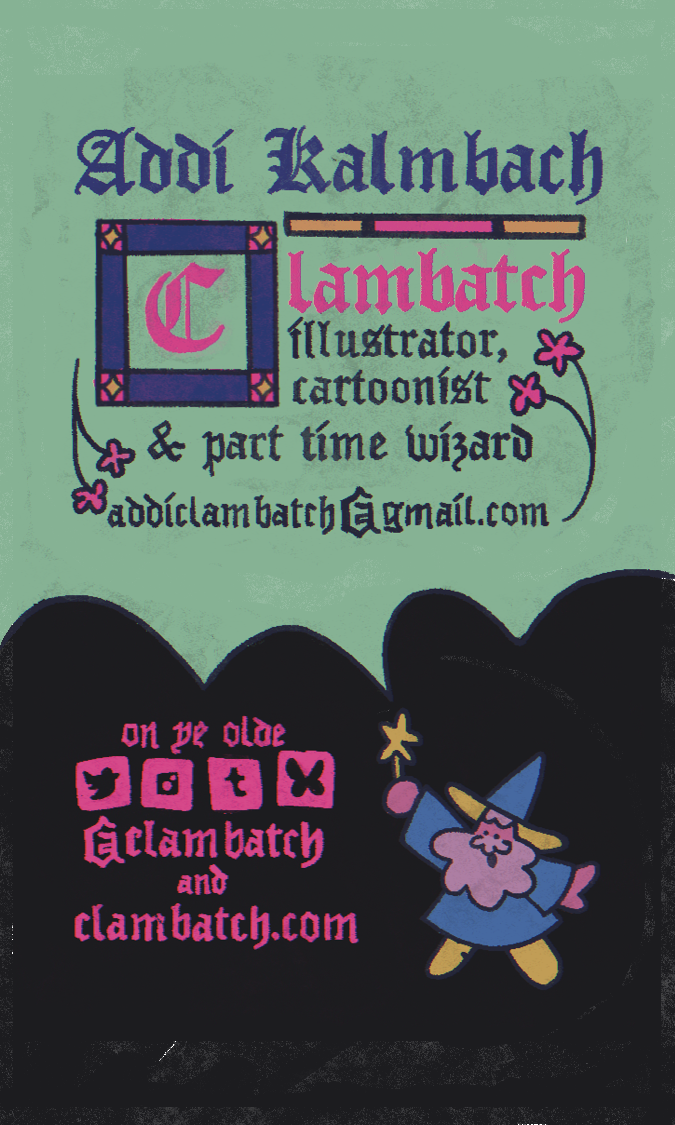 Addi Kalmbach (CLAMBATCH) is an illustrator and cartoonist located in Columbus, Ohio with a BFA in Comics and Narrative Practice from CCAD (2023). If they are not drawing, you can catch them sewing, playing DND, or dancing around with their cat, Spoon.
